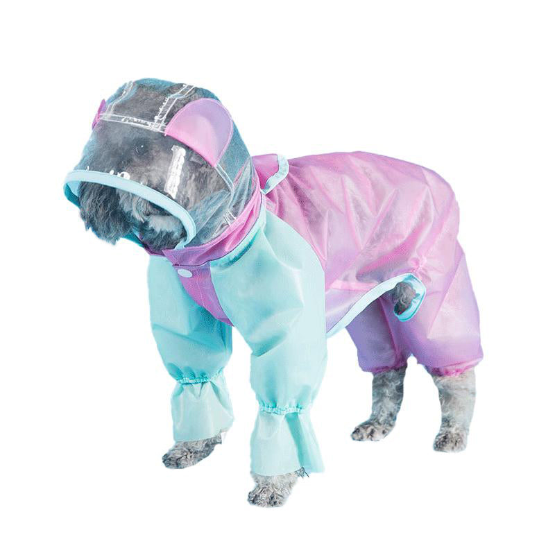 - The polyester blended outer shell is completely waterproof and designed to protect his entire body in the rainning day with fastener straps on each leg and a hood that can be drawn over his face.