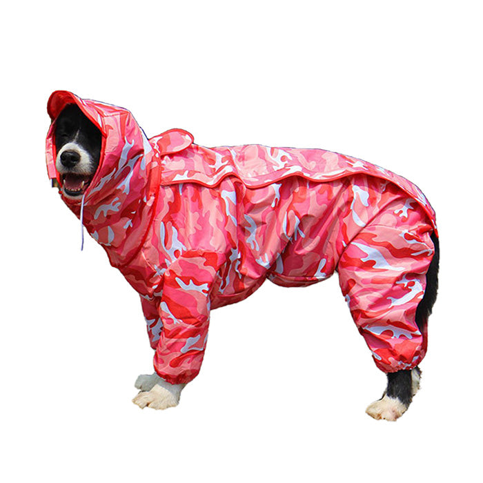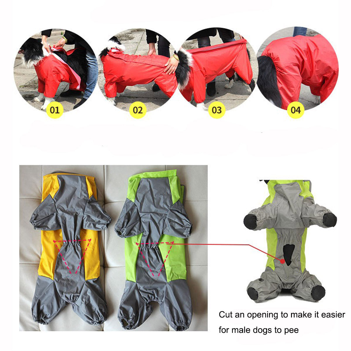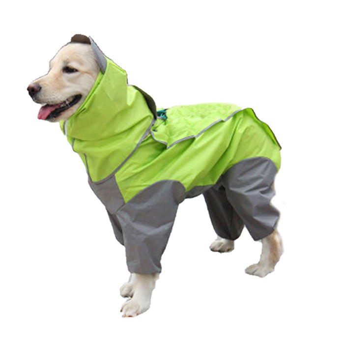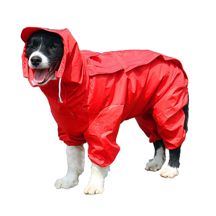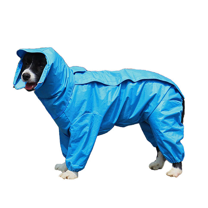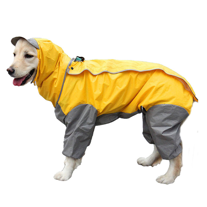 Keep your pet comfortable and dry even in the worst weather conditions. The four-legged dog raincoat is made of 100% polyester waterproof fabric—breathable. wear-resistant. tear-resistant. durable. easy to clean. There are fastener straps on each leg and a full cover on the dog's face.
