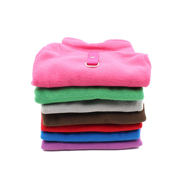 This fleece dog coat is a pullover that you can quickly and easily put on your dog. It doesn't require any Velcro or zippers to keep it secure. What's more. the vest features a D-ring on the back for easy attachment of a dog lead. which is perfect for short winter walks.